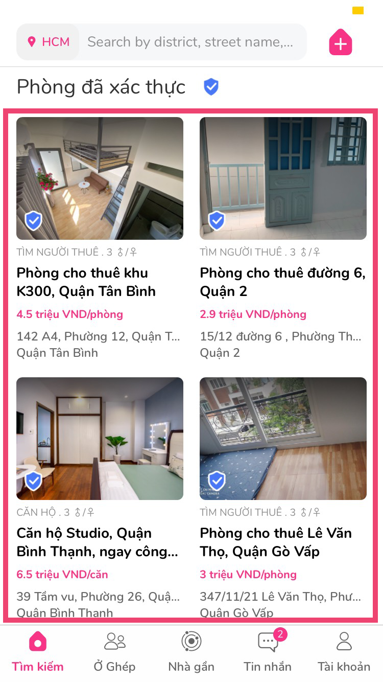 Gói top trang chủ hiện đang là gói mà nhiều chủ nhà trọ tin dung nhất hiện nay. Khi mua gói top trang chủ, bài đăng của chủ nhà sẽ được hiện lên 2 vị trí khác nhau là vị trí phòng xác thực ngay trang chủ của Ohana và vị trí đầu tiên trên quận của phòng của chủ nhà.