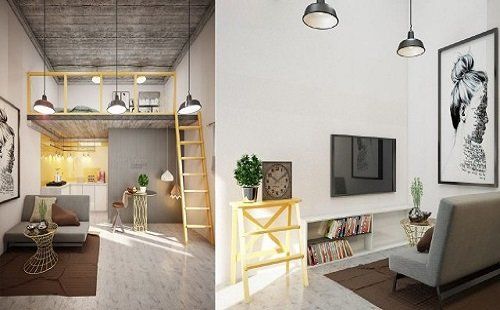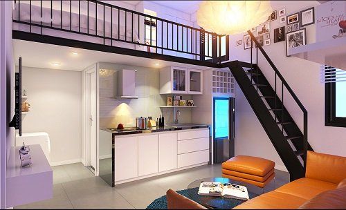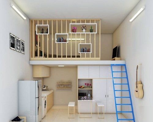 Phòng ngủ được thiết kế trên gác tách biệt hoàn toàn với không gian bên dưới bằng cách treo màn hoặc tạo vách ngăn. Tầng trệt có thể bày trí một số nội thất đơn giản, bếp được tối giản thay thế hoàn toàn bằng kệ và tủ treo tường không những giúp tiết kệm diện tích mà còn mang lại sự sang trọng cho căn phòng của bạn.