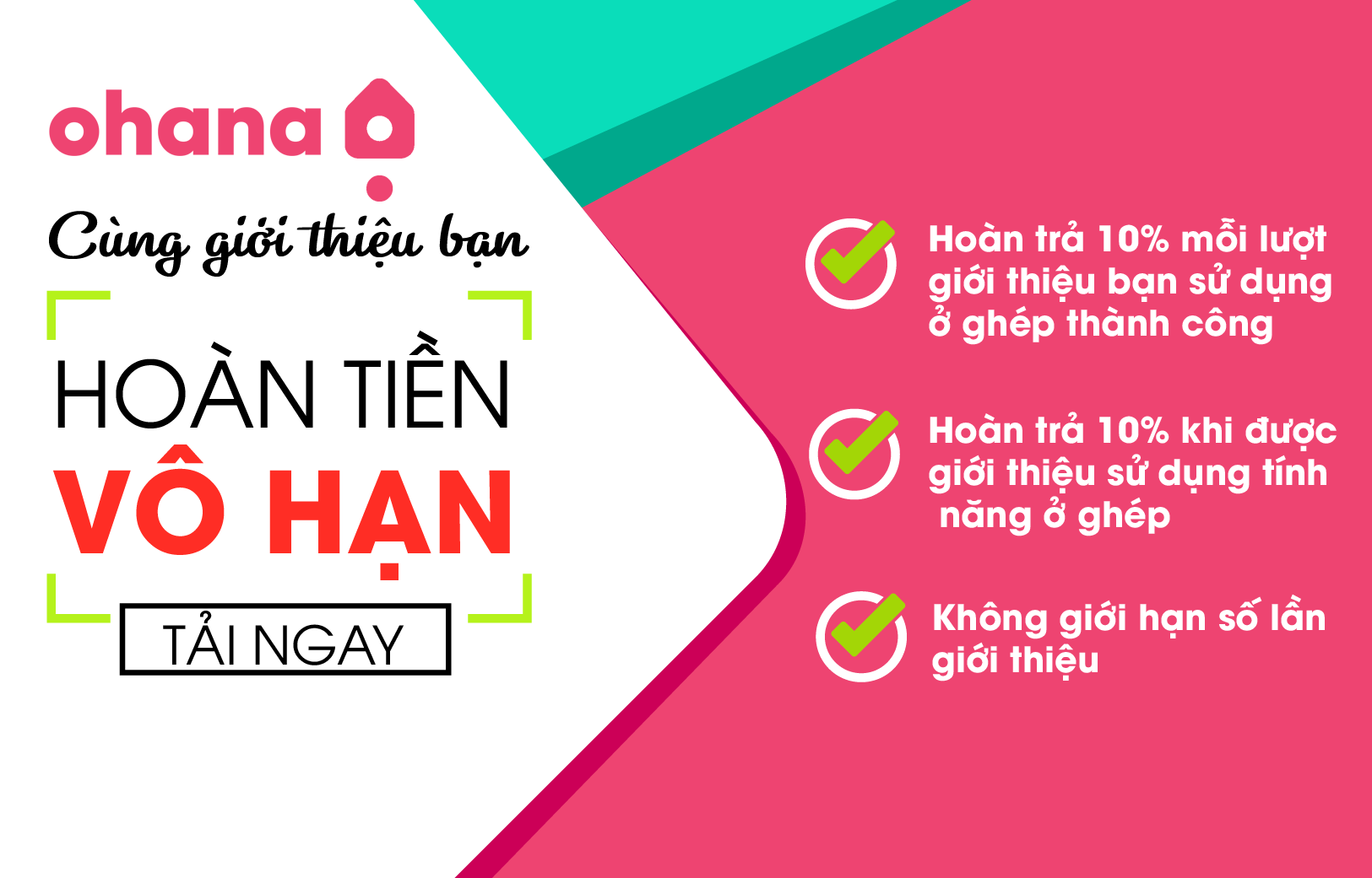 Tin vui cho các tín đồ Ohana, khi giới thiệu bạn bè cùng trải nghiệm tính năng ở ghép của Ohana, cả 2 cùng được nhận được hoàn tiền 10% cho gói ở ghép đã mua.
