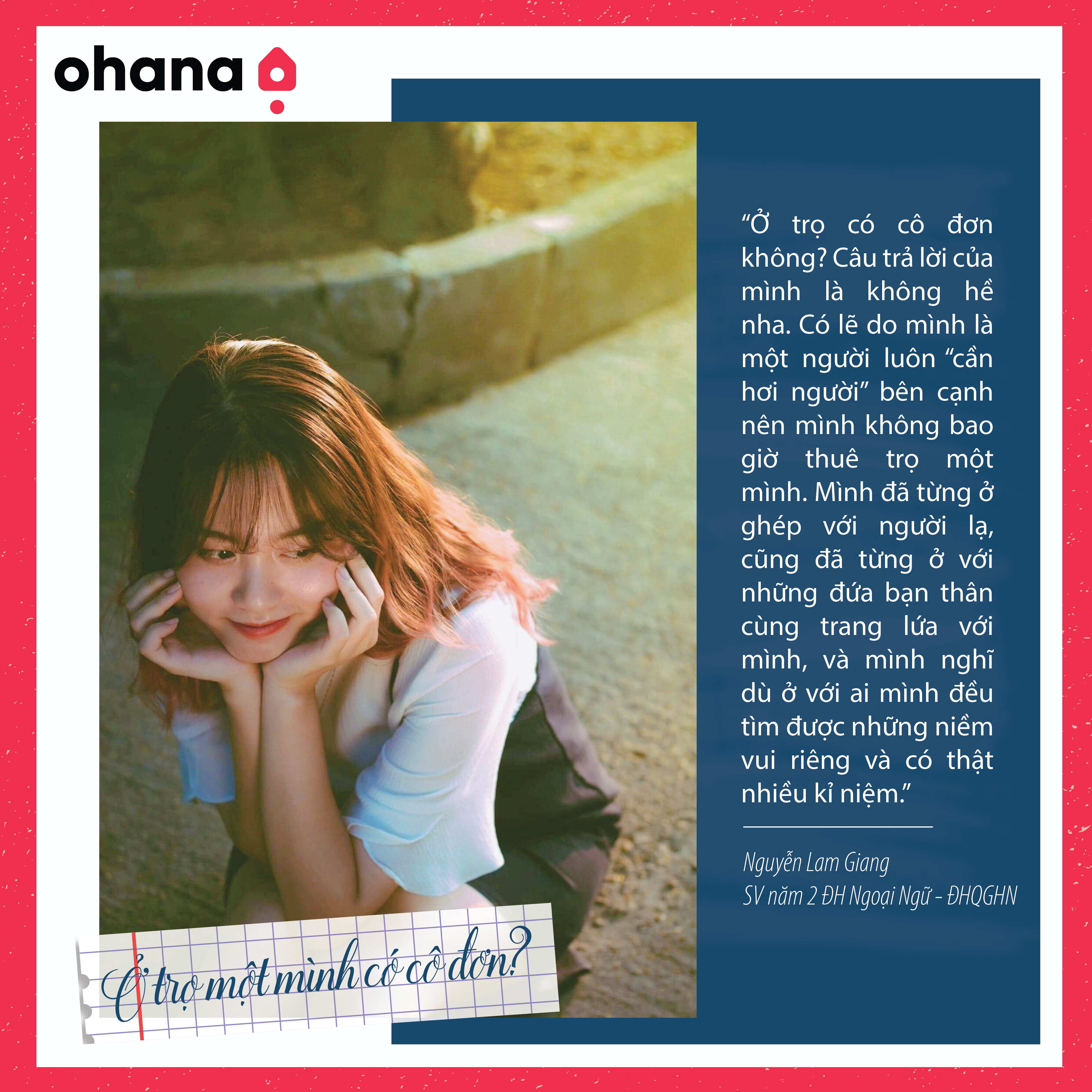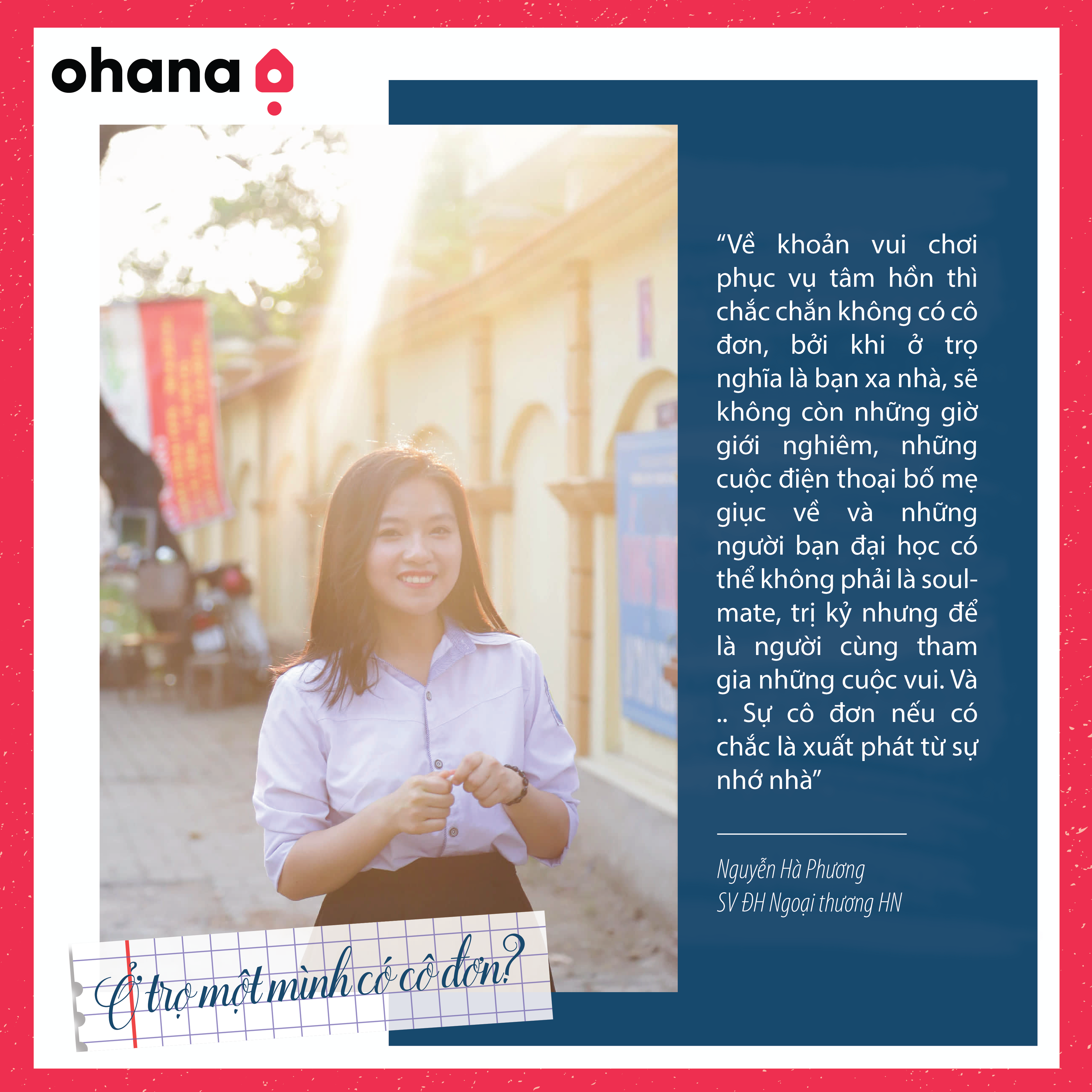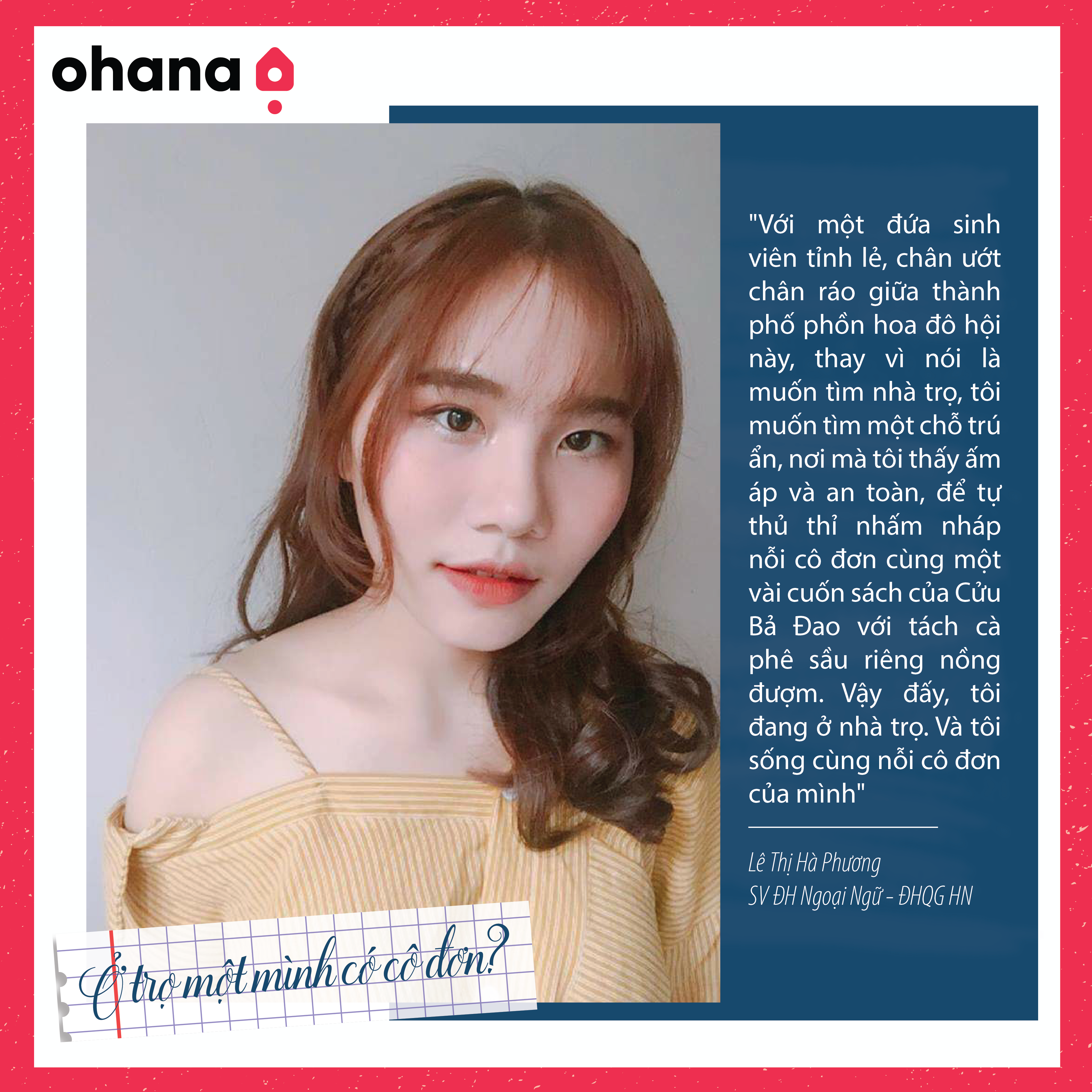 "Có điều gì liên quan đến ở trọ và cô đơn nhỉ? Cô đơn không phải là một căn phòng trong ngôi nhà của bạn, để bạn đóng cửa trốn tránh khi không muốn đối diện với vấn đề của mình. Cô đơn là từng góc tường, từng viên gạch ngói, cô đơn hiện diện trong khung hình của cuộc sống thường nhật. Phải, con người ai mà không khỏi cô đơn? Nhưng nếu để lựa chọn, tôi chắc chắn sẽ không chọn cách gặm nhấm nỗi cô đơn ở nơi tôi không thuộc về".