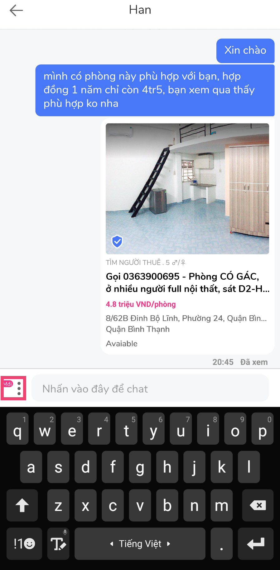 Trong quá trình chat với người đi thuê, chủ phòng có thể dễ dàng gửi thông tin phòng cho thuê ngay lúc khi chat. Nút gửi phòng cho thuê được thiết kế để chủ phòng có thể gửi bài toàn bộ bài đăng có sẵn trên app Ohana của chủ phòng để người thuê trọ có đầy đủ thông tin về phòng trọ và những thông tin đi kèm.
